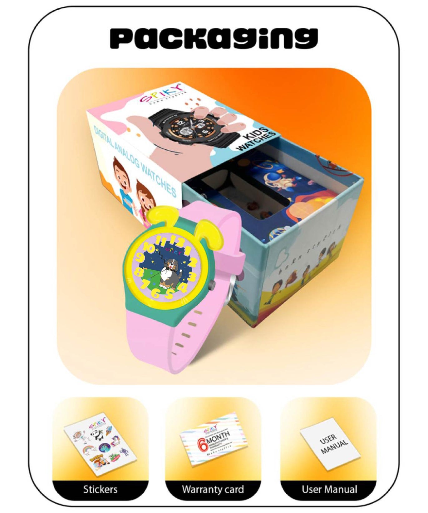 1 घड़ी, 1 वारंटी कार्ड, 1 उपयोगकर्ता मैनुअल, 1 स्टिकर