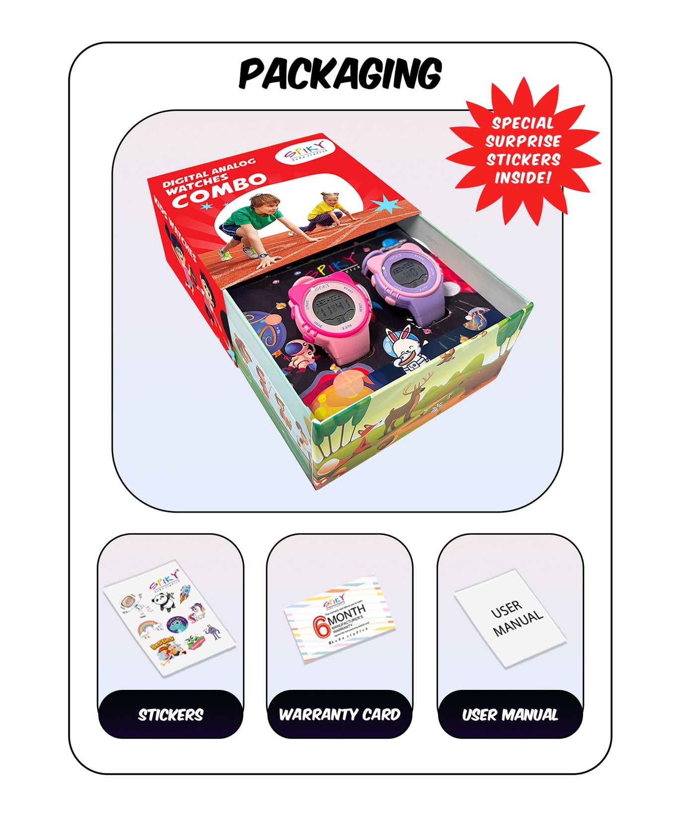 2 घड़ियाँ, 1 वारंटी कार्ड, 1 उपयोगकर्ता मैनुअल, 1 स्टिकर