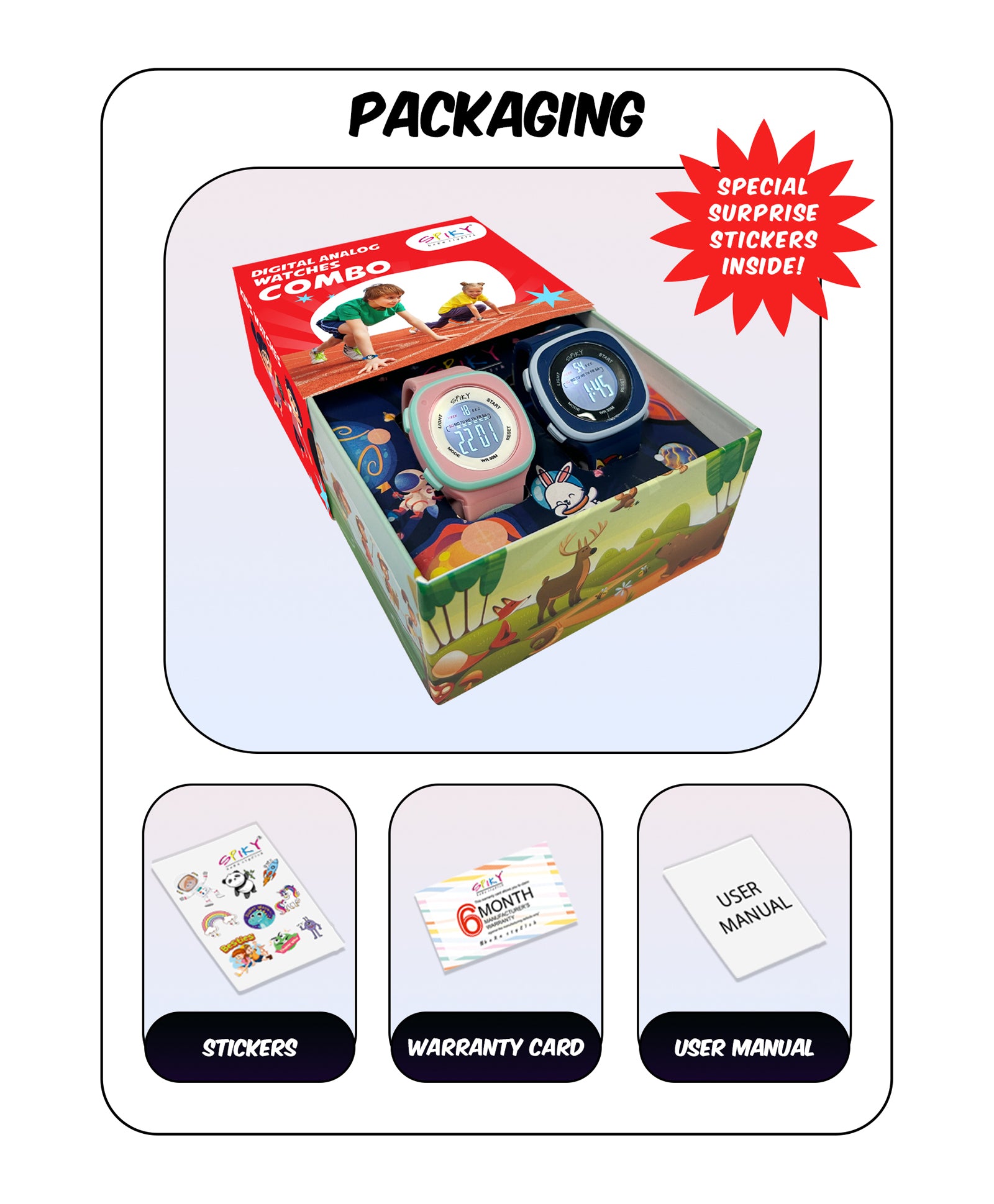 2 घड़ियाँ, 1 वारंटी कार्ड, 1 उपयोगकर्ता मैनुअल, 1 स्टिकर